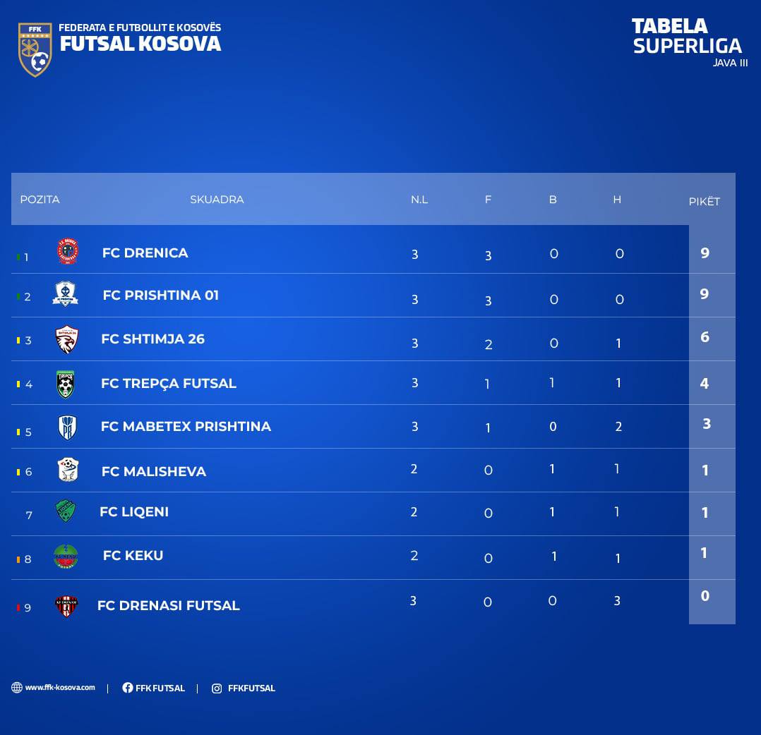 Drenica dhe Prishtina 01 kanë nga 9 pikë në dy pozitat e para. Trepça mban vendin e tretë me 4 pikë, ndërsa Mabetex Prishtina është e katërta me 3 pikë.