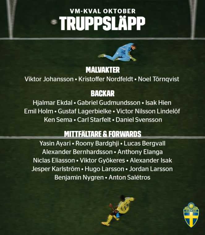 Selektori i Suedia, Jon Dahl Tomasson, të mërkurën shpalli listën e lojtarëve për dy ndeshjet e ardhshme të kualifikimeve për Kupën e Botës 2026.